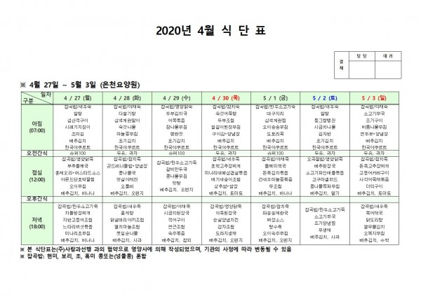 4월 넷째주 식단표 페이지 정보 작성자 은천노인복지회 작성일20-05-04 15:11 조회175,157회 댓글0건 관련링크 이전글 다음글 목록 답변 본문 . 이전글 다음글 목록 답변