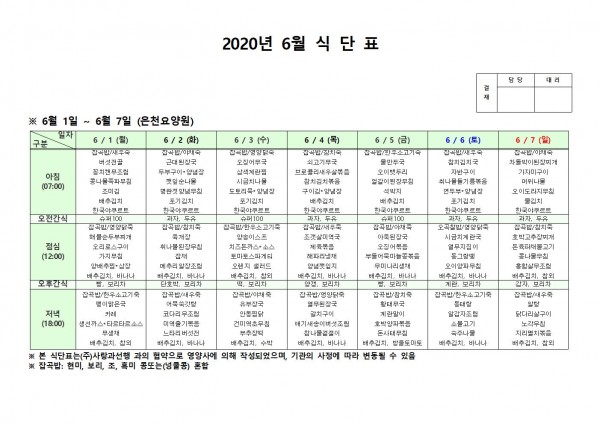 6월 첫째주 식단표 페이지 정보 작성자 은천노인복지회 작성일20-06-09 09:32 조회171,095회 댓글0건 관련링크 이전글 다음글 목록 답변 본문 호 이전글 다음글 목록 답변