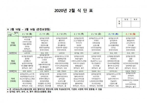 2월 둘째주 식단표 페이지 정보 작성자 은천노인복지회 작성일20-02-17 10:27 조회182,266회 댓글0건 관련링크 이전글 다음글 목록 답변 본문 ㅇㅅㅇ 이전글 다음글 목록 답변