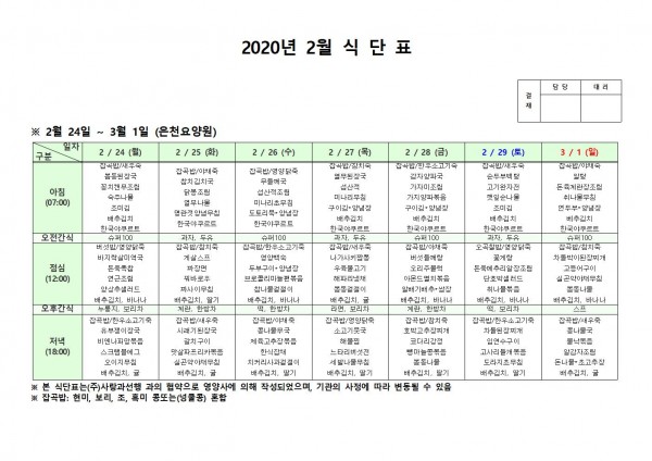 2월 넷째주 식단표 페이지 정보 작성자 은천노인복지회 작성일20-03-02 13:41 조회180,390회 댓글0건 관련링크 이전글 다음글 목록 답변 본문 2월 넷째주 식단표입니다 이전글 다음글 목록 답변