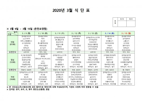 3월 둘째주 식단표 페이지 정보 작성자 은천노인복지회 작성일20-03-23 14:49 조회180,543회 댓글0건 관련링크 이전글 다음글 목록 답변 본문 . 이전글 다음글 목록 답변