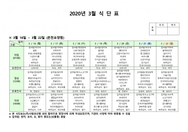 3월 셋째주 식단표 페이지 정보 작성자 은천노인복지회 작성일20-03-23 14:50 조회180,981회 댓글0건 관련링크 이전글 다음글 목록 답변 본문 . 이전글 다음글 목록 답변