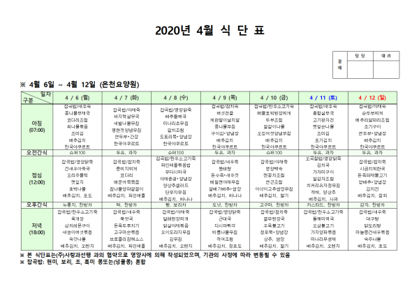 4월 첫째주 식단표 페이지 정보 작성자 은천노인복지회 작성일20-04-13 15:04 조회178,955회 댓글0건 관련링크 이전글 다음글 목록 답변 본문 . 이전글 다음글 목록 답변