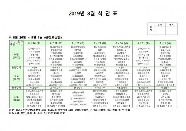 8월 다섯째주 식단표 페이지 정보 작성자 은천노인복지회 작성일19-09-04 17:29 조회197,623회 댓글0건 관련링크 이전글 다음글 목록 답변 본문 8월 다섯째주 식단표 이전글 다음글 목록 답변