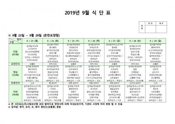 9월 넷째주 식단표 페이지 정보 작성자 은천노인복지회 작성일19-09-30 14:47 조회195,287회 댓글0건 관련링크 이전글 다음글 목록 답변 본문 9월 넷째주 식단표 이전글 다음글 목록 답변