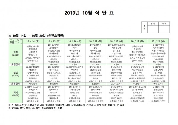 10월 셋째주 식단표 페이지 정보 작성자 은천노인복지회 작성일19-10-21 15:50 조회193,699회 댓글0건 관련링크 이전글 다음글 목록 답변 본문 10월 셋째주 식단표 이전글 다음글 목록 답변