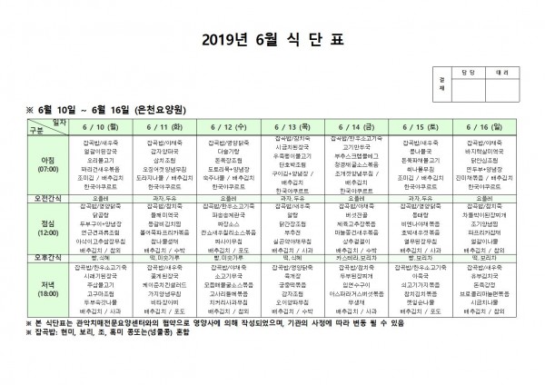 6월 둘째주 식단표 페이지 정보 작성자 은천노인복지회 작성일19-06-17 13:13 조회202,148회 댓글0건 관련링크 이전글 다음글 목록 답변 본문 6월 둘째주 식단표 이전글 다음글 목록 답변