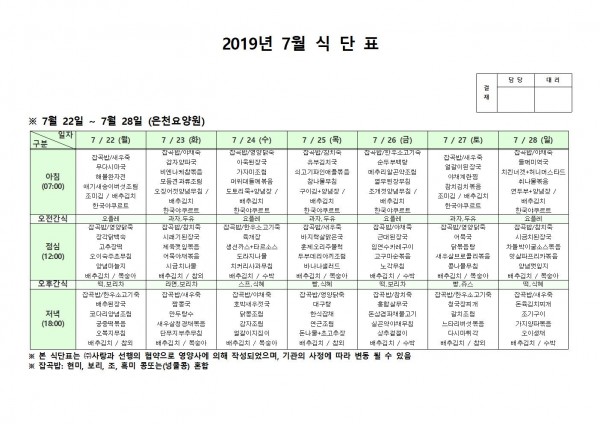 7월 넷째주 식단표 페이지 정보 작성자 은천노인복지회 작성일19-07-29 13:58 조회198,662회 댓글0건 관련링크 이전글 다음글 목록 답변 본문 7월 넷째주 식단표 이전글 다음글 목록 답변