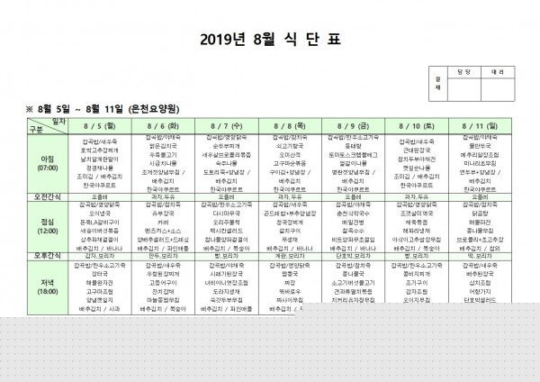 8월 둘째주 식단표 페이지 정보 작성자 은천노인복지회 작성일19-08-19 15:26 조회197,908회 댓글0건 관련링크 이전글 다음글 목록 답변 본문 8월 둘째주 식단표 이전글 다음글 목록 답변