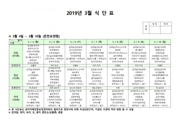 3월 첫째주 식단표 페이지 정보 작성자 은천노인복지회 작성일19-03-13 09:44 조회206,845회 댓글0건 관련링크 이전글 다음글 목록 답변 본문 3월 첫째주 식단표 이전글 다음글 목록 답변