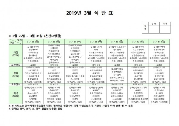 3월 넷째주 식단표 페이지 정보 작성자 은천노인복지회 작성일19-04-01 11:06 조회205,849회 댓글0건 관련링크 이전글 다음글 목록 답변 본문 3월 넷째주 식단표 이전글 다음글 목록 답변