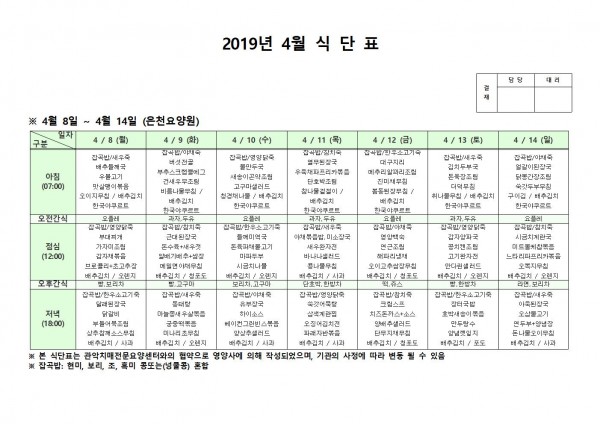 4월 둘째주 식단표 페이지 정보 작성자 은천노인복지회 작성일19-04-16 09:48 조회206,265회 댓글0건 관련링크 이전글 다음글 목록 답변 본문 4월 둘째주 식단표 이전글 다음글 목록 답변