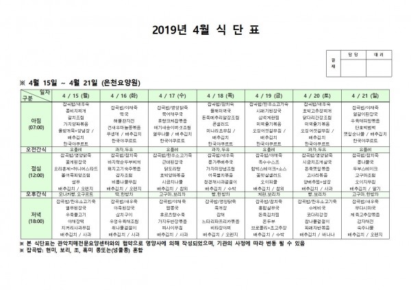 4월 셋째주 식단표 페이지 정보 작성자 은천노인복지회 작성일19-04-22 13:22 조회206,232회 댓글0건 관련링크 이전글 다음글 목록 답변 본문 4월 셋째주 식단표 이전글 다음글 목록 답변