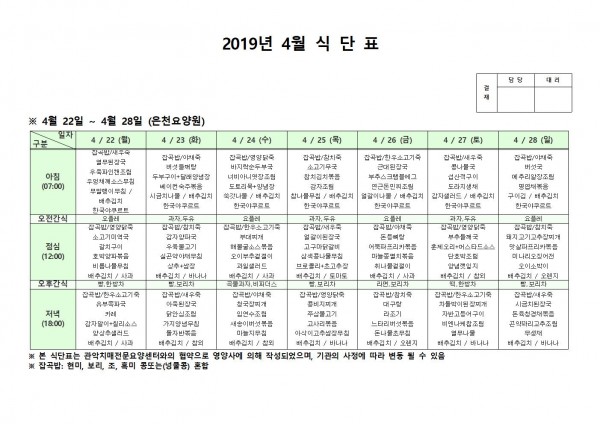 4월 넷째주 식단표 페이지 정보 작성자 은천노인복지회 작성일19-04-29 10:14 조회206,703회 댓글0건 관련링크 이전글 다음글 목록 답변 본문 4월 넷째주 식단표 이전글 다음글 목록 답변