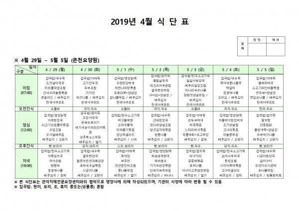 4월 다섯째주 식단표 페이지 정보 작성자 은천노인복지회 작성일19-05-07 14:13 조회205,752회 댓글0건 관련링크 이전글 다음글 목록 답변 본문 4월 다섯째주 식단표 이전글 다음글 목록 답변