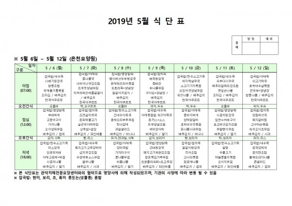 5월 첫째주 식단표 페이지 정보 작성자 은천노인복지회 작성일19-05-13 13:11 조회204,154회 댓글0건 관련링크 이전글 다음글 목록 답변 본문 5월 첫째주 식단표 이전글 다음글 목록 답변