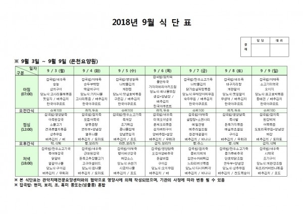 9월 첫째주 식단표 페이지 정보 작성자 은천노인복지회 작성일18-09-11 09:27 조회207,584회 댓글0건 관련링크 이전글 다음글 목록 답변 본문 9월 첫째주 식단표 이전글 다음글 목록 답변