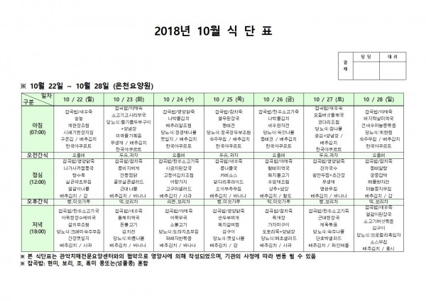 10월 넷째주 식단표 페이지 정보 작성자 은천노인복지회 작성일18-10-30 09:49 조회207,448회 댓글0건 관련링크 이전글 다음글 목록 답변 본문 10월 넷째주 식단표 이전글 다음글 목록 답변
