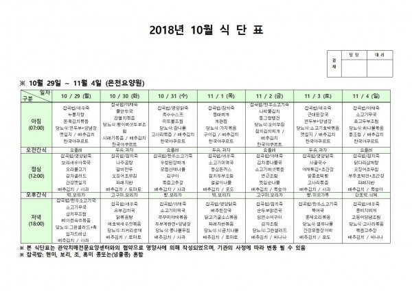 10월 5주째 식단표 페이지 정보 작성자 은천노인복지회 작성일18-12-07 09:36 조회208,137회 댓글0건 관련링크 이전글 다음글 목록 답변 본문 10월 5주째 식단표 이전글 다음글 목록 답변