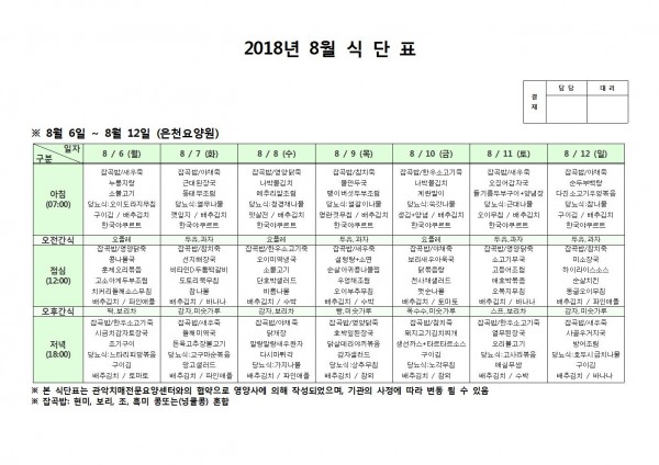 8월 둘째주 식단표 페이지 정보 작성자 은천노인복지회 작성일18-08-13 11:35 조회208,657회 댓글0건 관련링크 이전글 다음글 목록 답변 본문 8월 둘째주 식단표 이전글 다음글 목록 답변