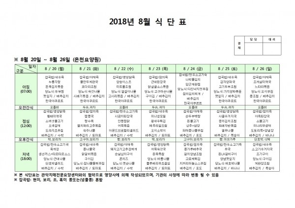 8월 넷째주 식단표 페이지 정보 작성자 은천노인복지회 작성일18-08-27 14:01 조회208,655회 댓글0건 관련링크 이전글 다음글 목록 답변 본문 8월 넷째주 식단표다 이전글 다음글 목록 답변
