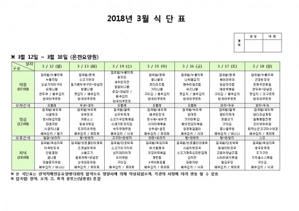 3월 셋째주 식단표 페이지 정보 작성자 은천노인복지회 작성일18-03-12 10:41 조회200,264회 댓글0건 관련링크 이전글 다음글 목록 답변 본문 3월 셋째주 식단표 이전글 다음글 목록 답변