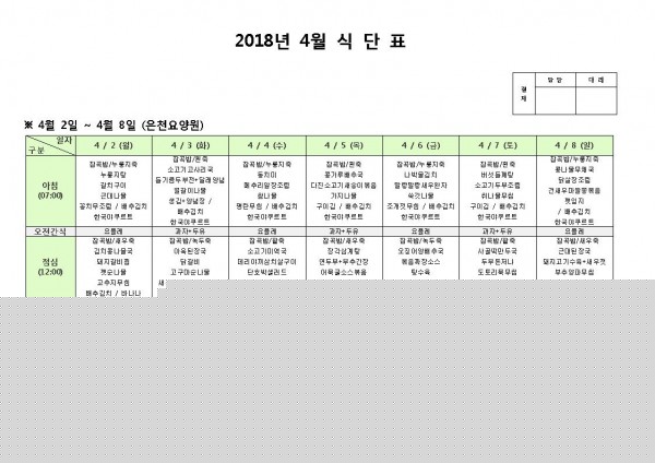 4월 첫째주 식단표 페이지 정보 작성자 은천노인복지회 작성일18-04-02 15:32 조회201,107회 댓글0건 관련링크 이전글 다음글 목록 답변 본문 4월 첫째주 식단표 이전글 다음글 목록 답변