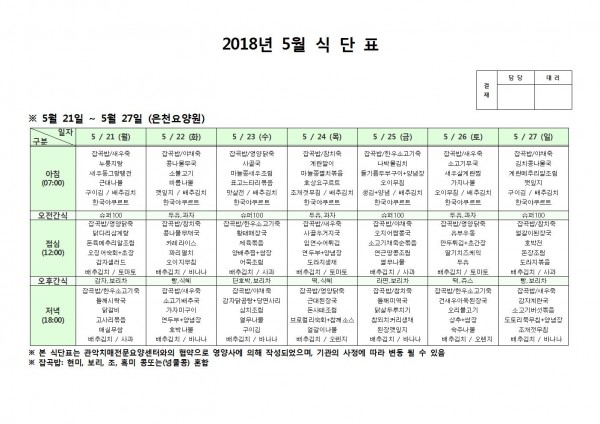 5월 넷째주 식단표 페이지 정보 작성자 은천노인복지회 작성일18-06-07 10:39 조회209,294회 댓글0건 관련링크 이전글 다음글 목록 답변 본문 5월 넷째주 식단표 이전글 다음글 목록 답변