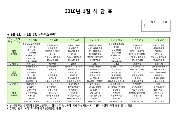 2018 1월 첫째주 식단표 페이지 정보 작성자 은천노인복지회 작성일18-01-03 11:34 조회194,309회 댓글0건 관련링크 이전글 다음글 목록 답변 본문 2018 1월 첫째주 식단표 이전글 다음글 목록 답변