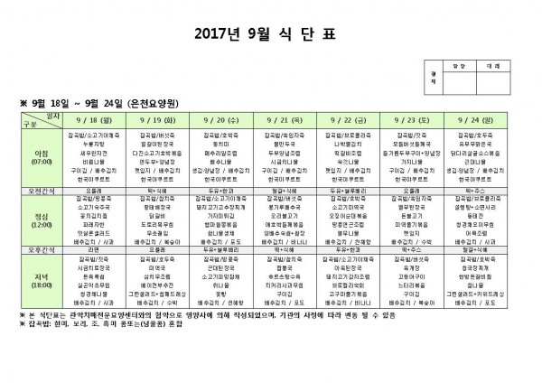 9월 셋째주 식단표 페이지 정보 작성자 은천노인복지회 작성일17-09-18 11:02 조회185,365회 댓글0건 관련링크 이전글 다음글 목록 답변 본문 9월 셋째주 식단표 이전글 다음글 목록 답변