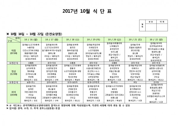 10월 셋째주 식단표 페이지 정보 작성자 은천노인복지회 작성일17-10-17 17:39 조회186,051회 댓글0건 관련링크 이전글 다음글 목록 답변 본문 10월 셋째주 식단표 이전글 다음글 목록 답변