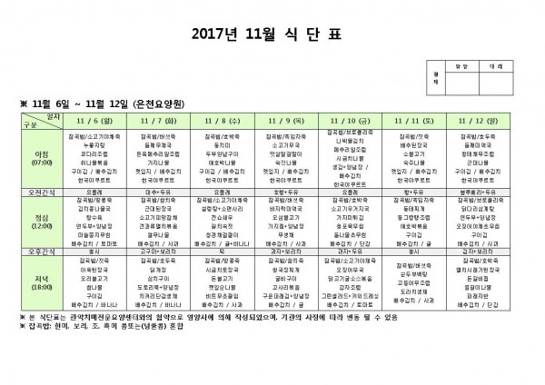 11월 둘째주 식단표 페이지 정보 작성자 은천노인복지회 작성일17-11-09 10:44 조회187,231회 댓글0건 관련링크 이전글 다음글 목록 답변 본문 11월 둘째주 식단표 이전글 다음글 목록 답변