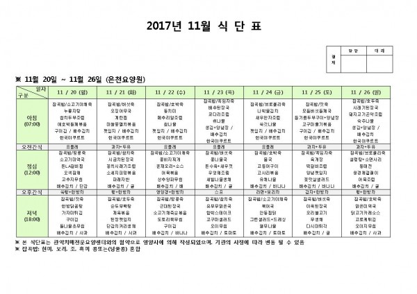 11월 넷째주 식단표 페이지 정보 작성자 은천노인복지회 작성일17-11-20 11:22 조회189,054회 댓글0건 관련링크 이전글 다음글 목록 답변 본문 11월 넷째주 식단표 이전글 다음글 목록 답변