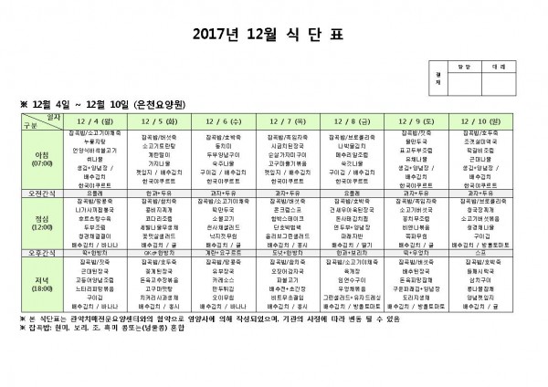 12월 둘째주 식단표 페이지 정보 작성자 은천노인복지회 작성일17-12-04 13:47 조회190,533회 댓글0건 관련링크 이전글 다음글 목록 답변 본문 12월 둘째주 식단표 이전글 다음글 목록 답변