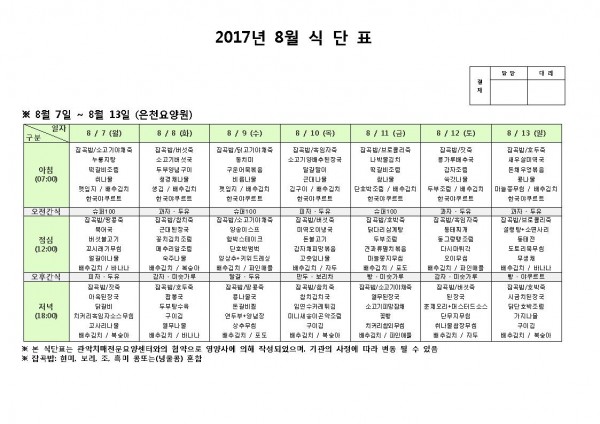 8월 둘째주 식단표 페이지 정보 작성자 은천노인복지회 작성일17-08-07 09:46 조회182,958회 댓글0건 관련링크 이전글 다음글 목록 답변 본문 8월 둘째주 식단표 이전글 다음글 목록 답변
