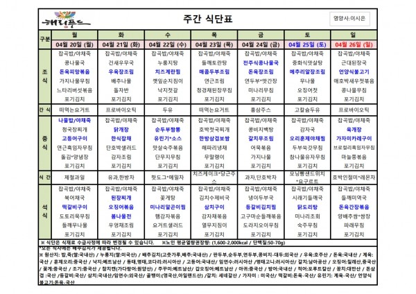 4월 셋째주 식단표 페이지 정보 작성자 은천노인복지회 작성일26-04-16 17:43 조회145회 댓글0건 관련링크 다음글 목록 답변 본문 4월 셋째주 어르신 식단표 안내해 드립니다. 정성과 영양을 담아 준비하겠습니다. 다음글 목록 답변