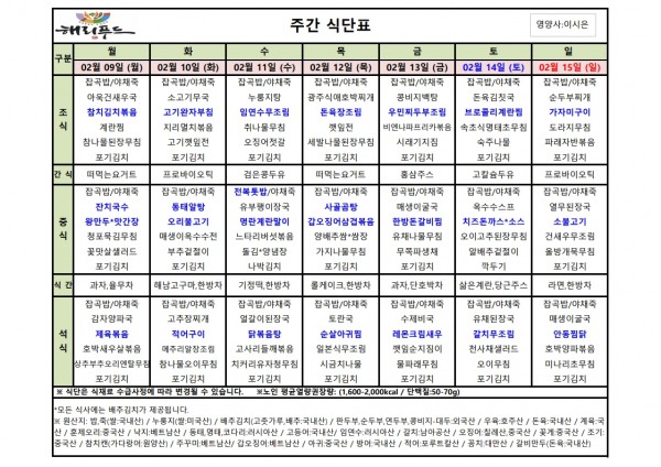 2월 둘째주 식단표 페이지 정보 작성자 은천노인복지회 작성일26-02-06 11:17 조회4,259회 댓글0건 관련링크 이전글 다음글 목록 답변 본문 2월 둘째주 어르신 식단표 안내해 드립니다. 정성과 영양을 담아 준비하겠습니다. 이전글 다음글 목록 답변