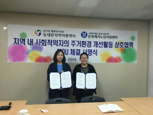 동대문지역자활센터와 협약 페이지 정보 작성자 은천노인복지회 작성일17-01-11 15:47 조회36,481회 댓글0건 관련링크 이전글 다음글 목록 답변 본문 동대문지역 자활센터와 협약을 체결하여어르신들 도배장판 교체에 도움을 주시기로 하였다. 이전글 다음글 목록 답변